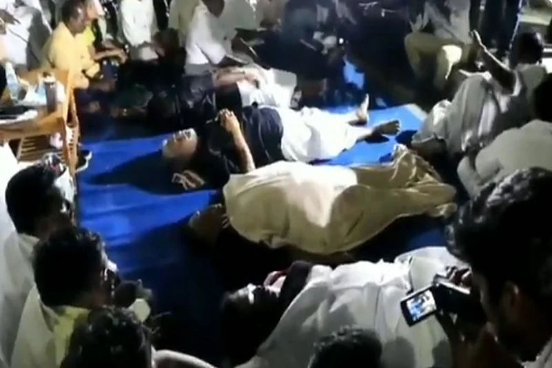 Taking the political fight with Puducherry Governor and former top cop Kiran Bedi to the streets, Congress' Chief Minister V Narayanasamy along with his ministers and party MLAs sat on a dharna outside the Raj Nivas and even spent the night on the road.