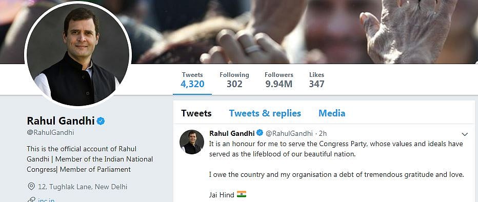 Hours after he issued his final statement in the capacity of the Congress party President, Rahul Gandhi on Wednesday changed his Twitter bio, which now says, "This is the official account of Rahul Gandhi | Member of the Indian National Congress| Member of Parliament."