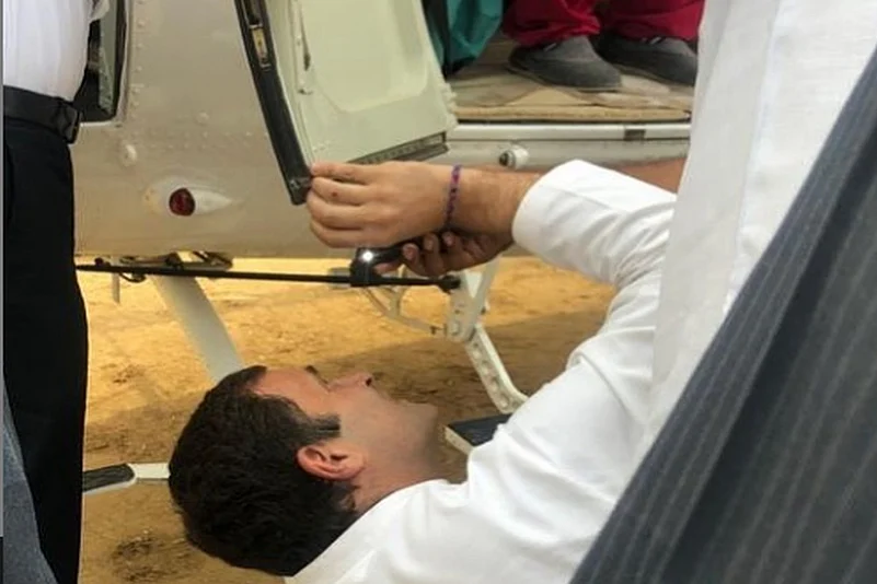 Congress president Rahul Gandhi on Friday shared a picture on Instagram where he can be seen lying on the ground and fixing his helicopter.