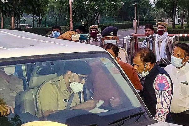 Television channels showed a Rajasthan police vehicle being stopped outside the Manesar hotel for nearly an hour by policemen from the BJP-ruled state.