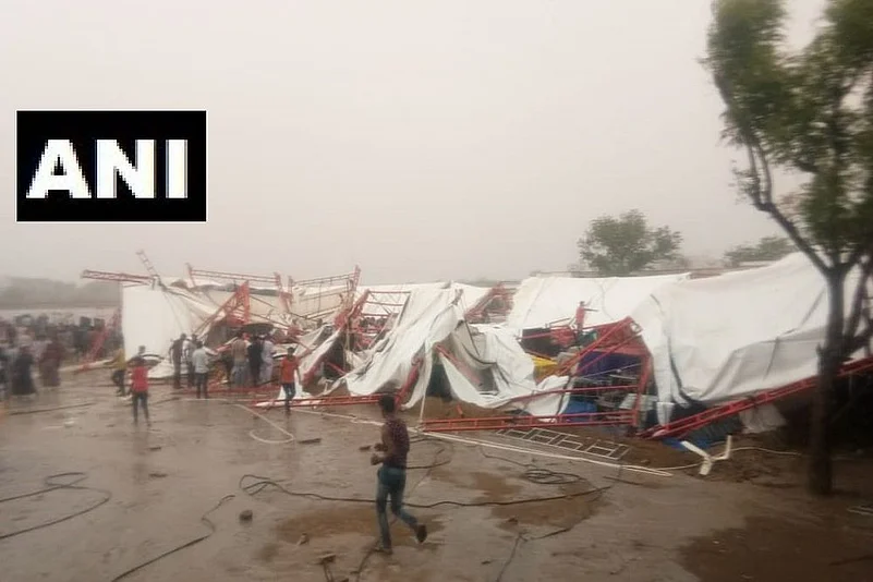 At least 14 people have died, and 50 sustained injuries when a massive tent erected for people attending a religious gathering collapsed during a dust storm in Rajasthan's Barmer on Sunday, police said.