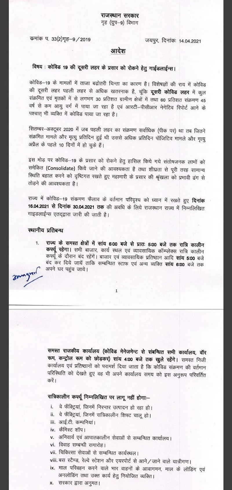Owing to the rise in the cases the government has issued new guidelines on Wednesday - According to which a strict curfew will be imposed across the state between 6 PM to 5 Am. As per the revised guidelines the private offices and markets to close by 5 PM, whereas government offices to close at 4 PM till April 30, 2021. Rajasthan on Wednesday saw a new high of 6,200 Covid cases, out of which the highest number was registered in Jaipur, at 1329. The death toll was also the highest to date, with 29 fatalities in the last 24 hours.