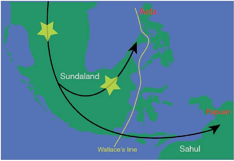 Proposed modern human migration route into Southeast Asia about 20,000 years ago with potential locations of admixture of modern humans with the archaic human known as Denisovan (yellow asterisks). Green indicates the above water landmass at the glacial maximum and white outlines indicate present-day shorelines