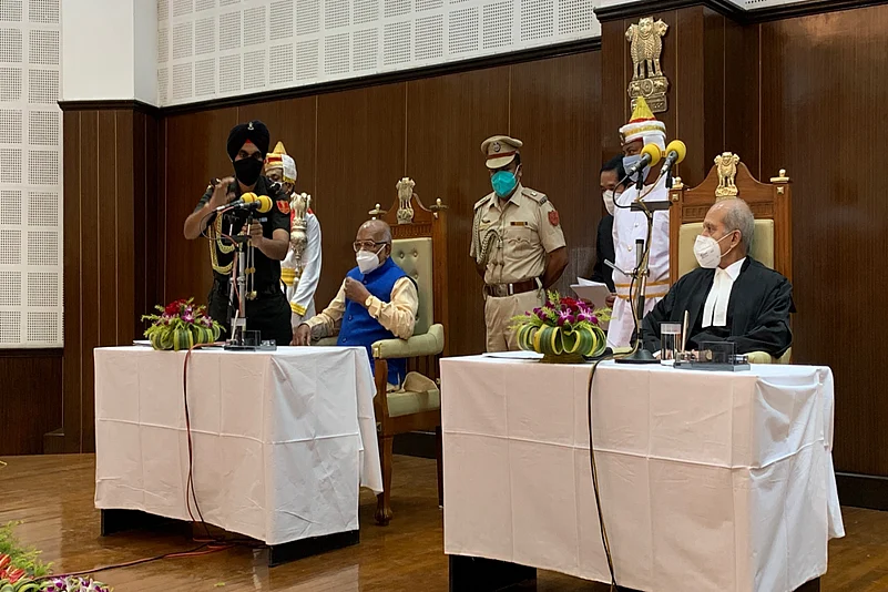 Satyadev Narayan Arya takes oath as the new governor of Tripura on Wednesday. Akhil Abdulhamid Khureshi, Chief Justice of High Court of Tripura administered the oath of office to the new governor at the old Raj Bhavan in Agartala.