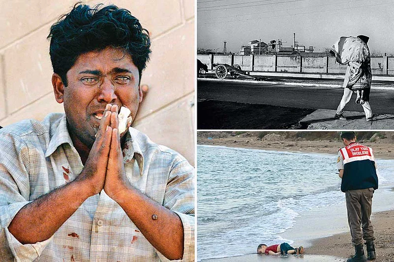 (Clockwise from left) Qutubuddin Ansari, the ‘face’ of the 2002 Gujarat riots; A man carrying his wife’s body outside the Union Carbide plant in Bhopal after the 1984 gas disaster; three-year-old Alan Kurdi’s death in 2015 became a symbol of the Syian refugee crisis.