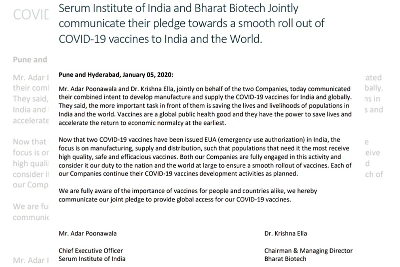 Joint statement issued by Bharat Biotech and Serum Institute of India