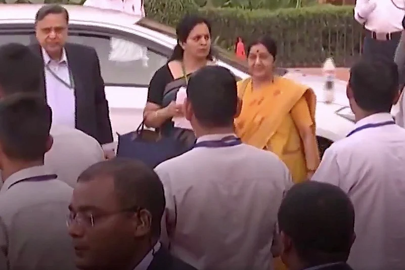 External Affairs Minister Sushma Swaraj was missing from the dais for the ministers to be inducted in the new Cabinet during Prime Minister Narendra Modi's swearing-in ceremony here on Thursday evening.