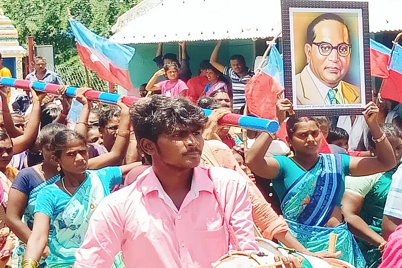 I was in Belgium when I first spotted that sun-drenched photograph on Twitter—a proud woman wearing a bright blue sari, holding high a framed portrait of B.R. Ambedkar, and behind her, other women carrying the red-and-blue flagpole painted in the colours of the Viduthalai Chiruthaigal Katchi (Liberation Panthers Party, in short, VCK) in their arms, decked in bangles. It was September 6. Peering from behind the sea of heads and four VCK flags were two young children. There were two middle-aged men, both onlookers. Bang at the centre of the picture, without appearing to intrude into it, was a young man in a pink shirt beating a drum with an intense, faraway look in his eyes.