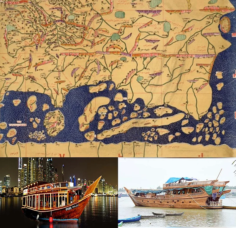 A curious and colourful Genoese world map from 1457. The depiction of India and much of Asia is clearer—the imagery is based on descriptions by traders and travellers like Marco Polo and Niccolo dei Conti. Kerala’s Uru (Below right) and Dubai’s Dhow—the boats that carried goods between Malabar and the Arabian peninsula in the old days.