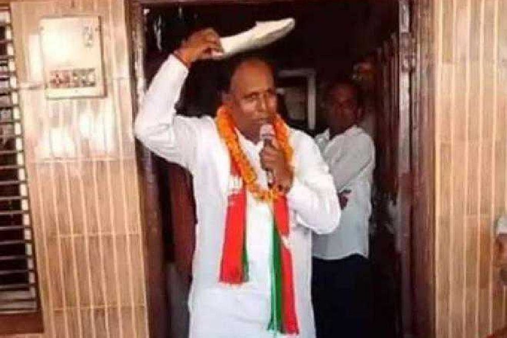 Jagdish Nayar, the BJP candidate from Hodal (reserved) constituency in Palwal district of Haryana, is seeking votes for the October 21 Assembly elections by placing a shoe on his head.