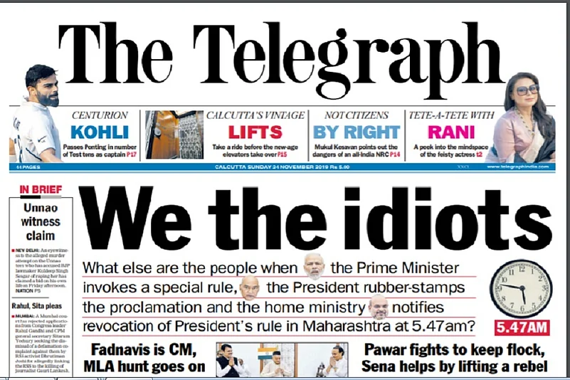 Known for its blunt cum catchy headlines, The Telegraph carried "We, the idiots" as the headline, hinting at the beginning of the Preamble to the Indian Constitution with "We, the people".