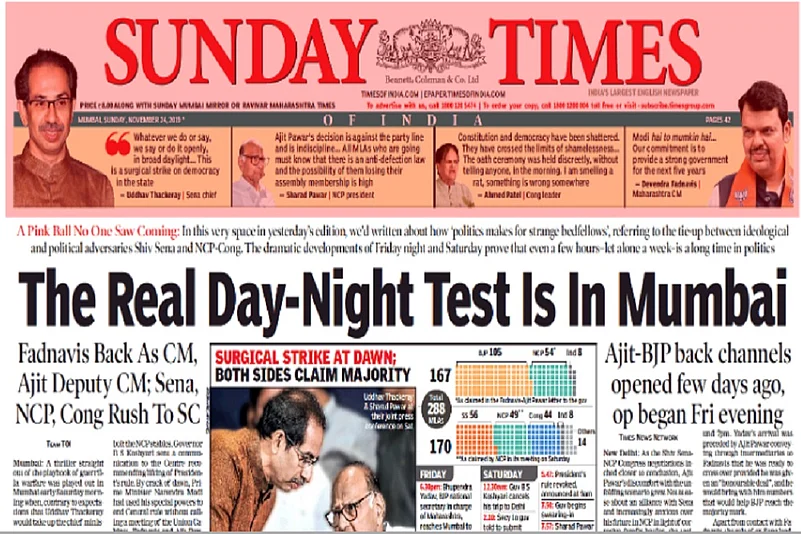 Hindustan Times' story on the political twist ran with "Maharashtra drama continues: Fadnavis is CM, Ajit his deputy". English daily Times of India drew a comparison with the ongoing India-Bangladesh day-night test match in Kolkata. "The real Day-Night test is in Mumbai," the headline read.