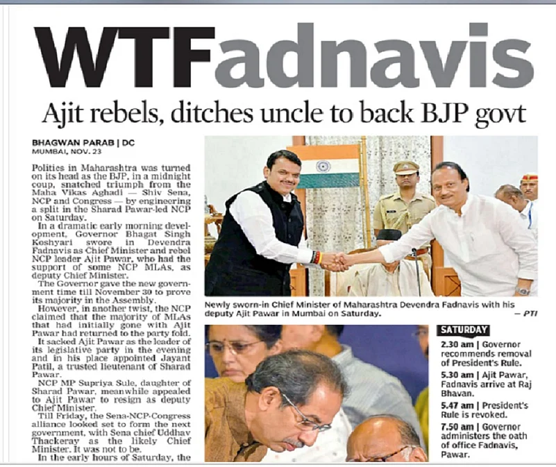 While The Sunday Guardian read: "Pawar outplays Pawar in Maha stunt", the Mail Today ran "Maha coup - the inside story" as the headline, and the New Sunday Express carried the story with "Confusion after coup".