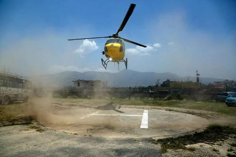 Scores of people gathered to watch as Ramesh Chand Meena, donning traditional attire and sunglasses, along with his wife Somoti and grandson Ajay, boarded a chopper at a helipad near his school in Saurai to fly to their home in Malawali village, which is 22 km away.