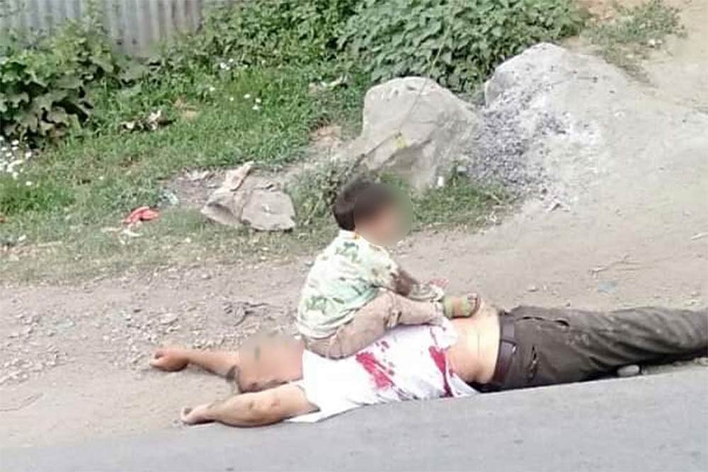 In heart-wrenching pictures, the boy can be seen sitting on the dead body of his grandfather who was killed in the crossfire. The boy was picked up by the army and police personnel as they attended to him post the trauma.