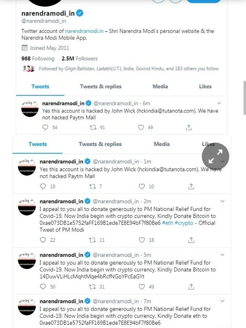 One of tweets on the Twitter account of PM Modi’s personal website read: "I appeal to you all to donate generously to PM National Relief Fund for Covid-19, Now India begin with crypto currency, Kindly Donate eth to 0xae073DB1e5752faFF169B1ede7E8E94bF7f80Be6."