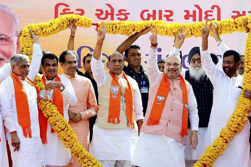 Union ministers Rajnath Singh and Nitin Gadkari and leaders of NDA allies, including Shiv Sena chief Uddhav Thackeray, SAD supremo Parkash Singh Badal and LJP founder Ram Vilas Paswan were present on the stage with Shah.