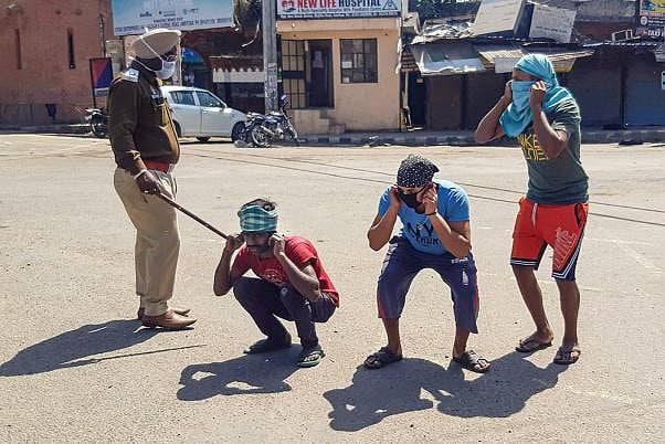 In one such case of police high handedness, people possibly going to their native places were made to hop along a road with their bags strapped on their backs as a punishment for violating the lockdown.