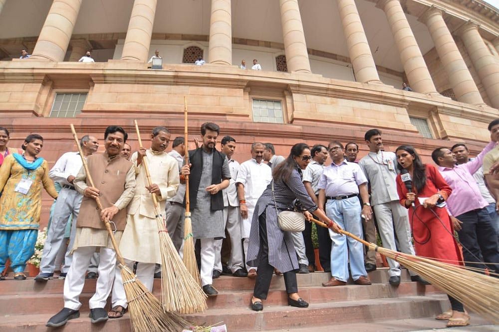 Actor and BJP MP Hema Malini, accompanied by Minister of State For Finance Anurag Thakur, on Saturday morning swept the road on the Parliament premises.