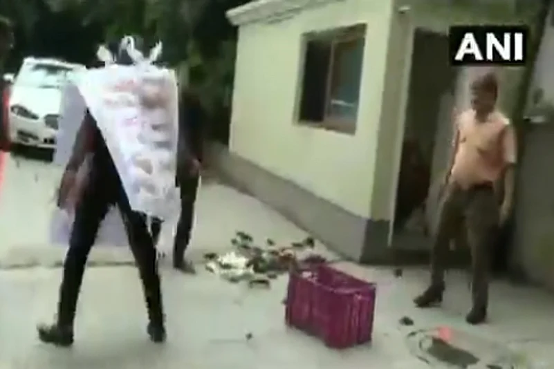 In a video shared by news agency ANI, NCP supporters can be seen carrying a crate containing crabs. Throwing the crate on the floor, the supporters then let the crabs spread all over.