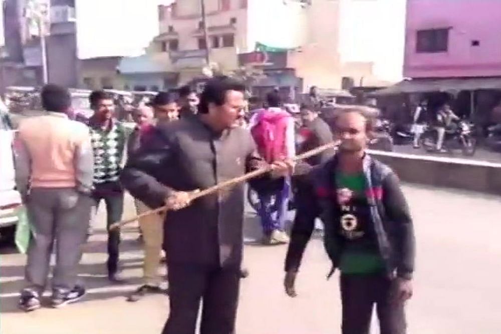 Mohd Miya, a BJP leader, is seen hitting the man with a stick and poking at his face with it. The BJP leader abuses him and says, “hatt, hatt (go away).”