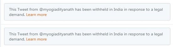 A message in place of the tweets reads, "This Tweet from @myogiadityanath has been withheld in India in response to a legal demand."