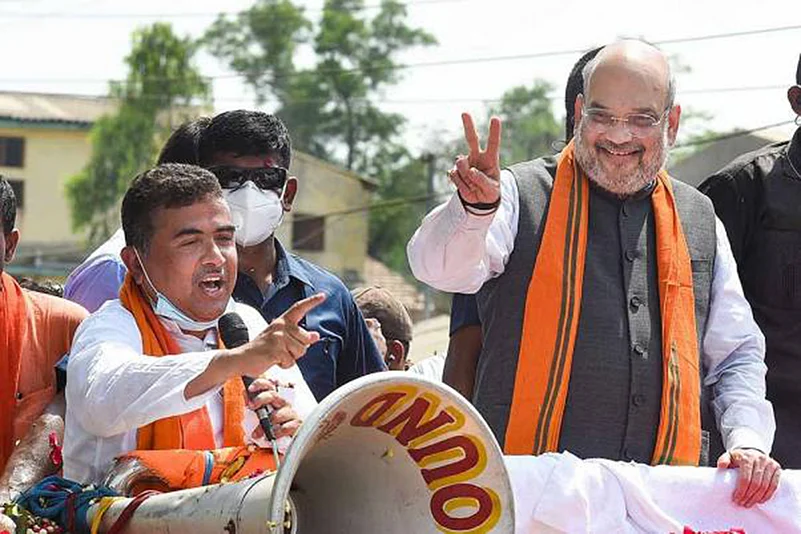 Standing atop a lorry, decked with flowers and BJP flags, Shah, with Suvendu Adhikari by his side, waved at enthusiastic crowds that gathered along the four-km stretch between Bethuria and Rayapara in the East Midnapore Assembly segment.