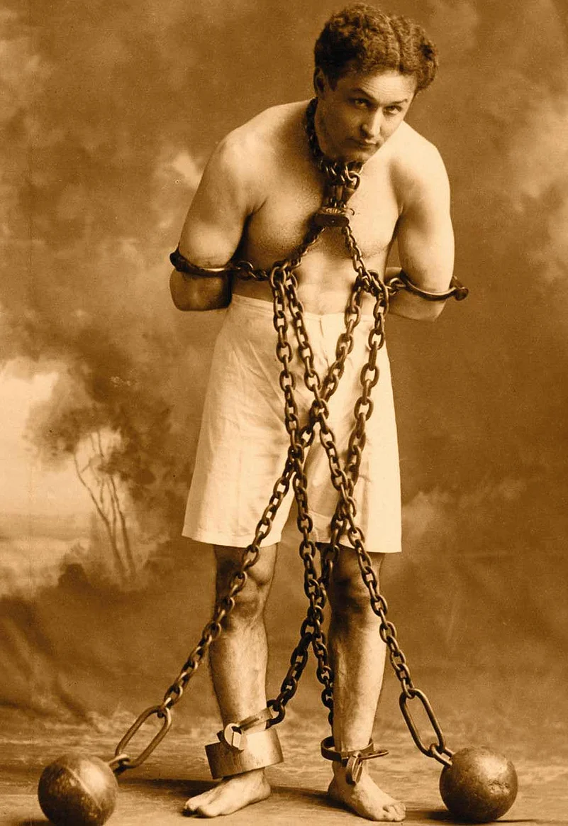 Since audience interactions at magic shows are pastiches of ceded agency and control, aspiring to that kind of subtle engagement surely requires something more the two hours of practice he puts in daily—an hour each before bed and on waking up without fail. If anything, should it not warrant the sort of rigorous prep he undertook for the escape acts that for so long dominated his oeuvre? “What, being handcuffed, bound in chains and locks, feet tied together, and hung upside down from a tree for hours on end? It took nearly two years to work my way down from needing three hours to free myself to doing it in under a minute,” he says, somehow wearing the perma-smile while stifling a yawn. “And I’m no spring chicken anymore,” the 55-year-old adds.