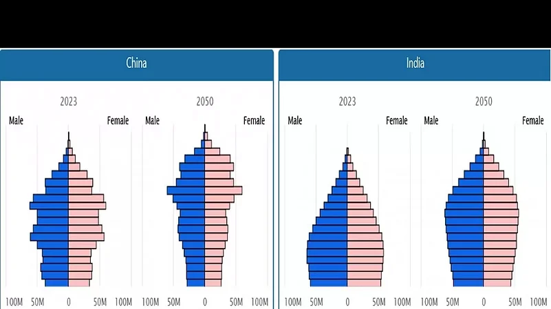 FIGURE 1: Population Pyramid, India and China, 2023 to 2050 (Source: US Census Bureau, International Database.