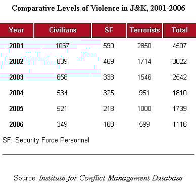 On the ground in J&K, the secular decline in terrorist violence, a trend discernible since 2001, continues. But the terrorists’ capacity to strike at important targets and to maintain a threshold level of violence, nevertheless, remains undiminished. Approximately 219 people, including 79 civilians and 111 terrorists, have already died in militancy-related violence in 2007 (Data till April 27. Source: South Asia Terrorism Portal).