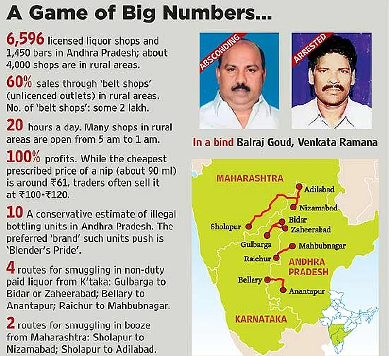 It all began with a surprise check by the ACB on a Tata Victa belonging to excise officials on December 13 in Karimnagar district. Some Rs 3.62 lakh in cash was seized, clearly the proverbial tip of the iceberg. It’s been so much liquor under the bridge since—raids and investigations over the last two months have unravelled an extensive web. Bribes were paid to facilitate numerous violations of excise laws—sale of liquor above MRP, sale of loose liquor and fake spirits, smuggling of liquor evading duty, operation of illegal outlets in rural areas (known locally as ‘belt shops’), flouting of set sale timings.
