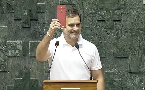 Congress leader Rahul Gandhi on Tuesday took oath as a member of the 18th Lok Sabha and concluded it with Jai Hind, Jai Samvidhan (Constitution) while carrying a copy of the latter.
