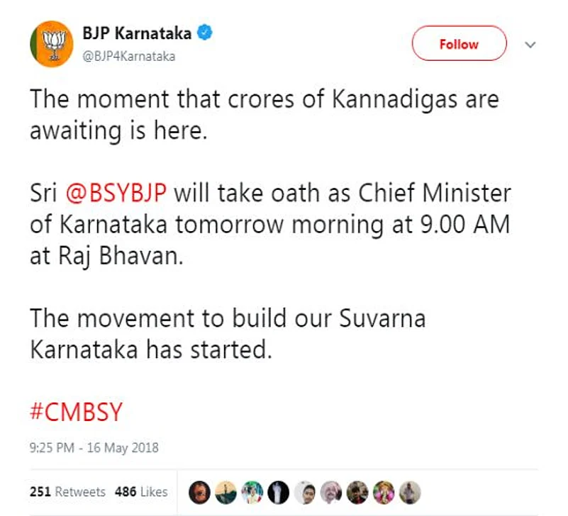 Interestingly, earlier the BJP Karnataka had deleted it tweet announcing Yeddyurappa’s swearing-in as the CM on Thursday at 9.30 am. Here's the screenshot of the tweet: