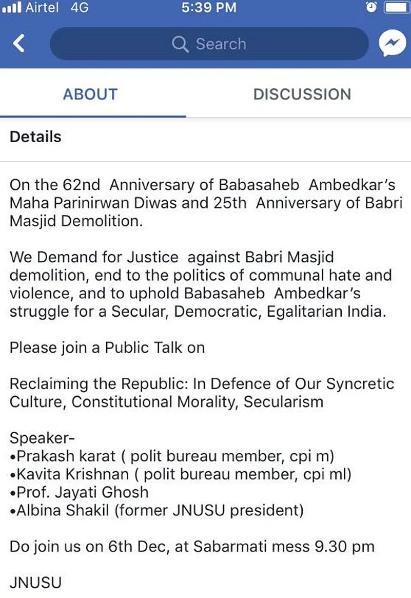 Karat was to speak on "Reclaiming the Republic" where he would discuss the demolition of the Babri Masjid. While the Karat talk was organised by the JNU Students' Union (JNUSU) and also featured Jayati Ghosh and Kavita Krishnan, the Swamy talk was being organised by "interested students" who are not functioning under a particular organisation, the report added.