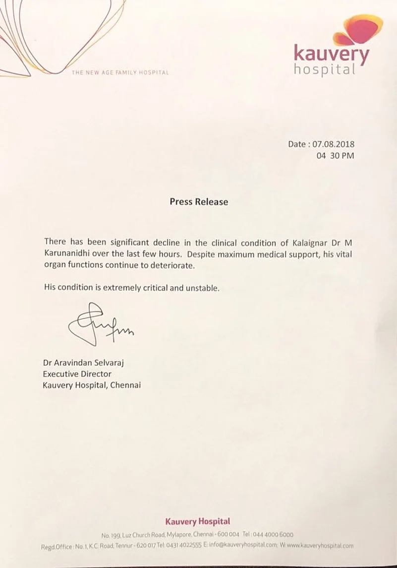 4:36 PM IST: The Kauvery Hospital medical bulletin on Karunanidhi's health.