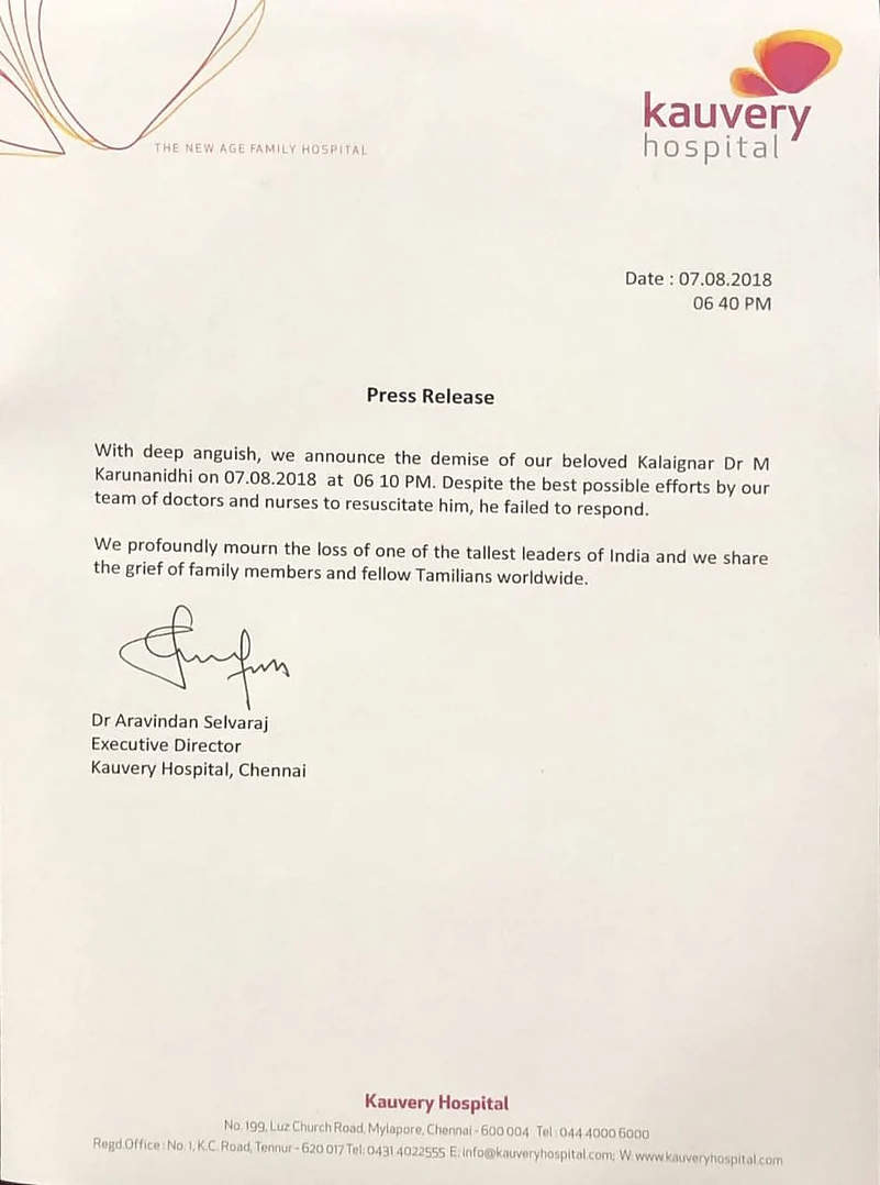 "Dr.M Karunanidhi passed away at 6.10 pm. Despite best efforts of our doctors and nurses to resuscitate him, he failed to respond," Kauvery Hospital said in a statement.
