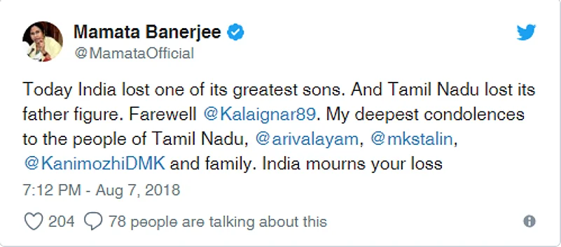 Bengal CM Mamata Banerjee condoles the death of Kalaignar.