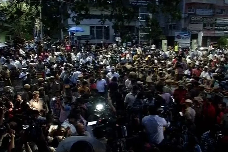 Lawyers for DMK reach residence of Madras High Court acting Chief Justice Huluvadi G. Ramesh who had agreed to hear today a case against denial of burial land by Tamil Nadu Govt at Marina beach for Karunanidhi.