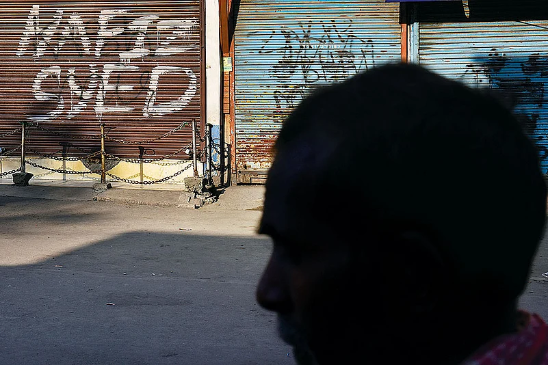 The name, Hafiz Saeed, is written in graffiti style on a shop shutter in the Habba Kadal area of Srinagar