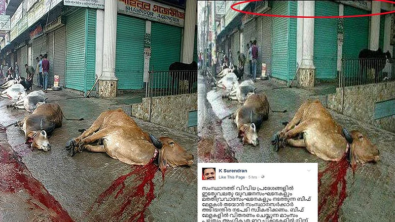 A Google search shows the picture he had posted was that of cow slaughter in Bangladesh, and Surendran had allegedly cropped out the sign boards in Bengali and people wearing kurta pyjama.