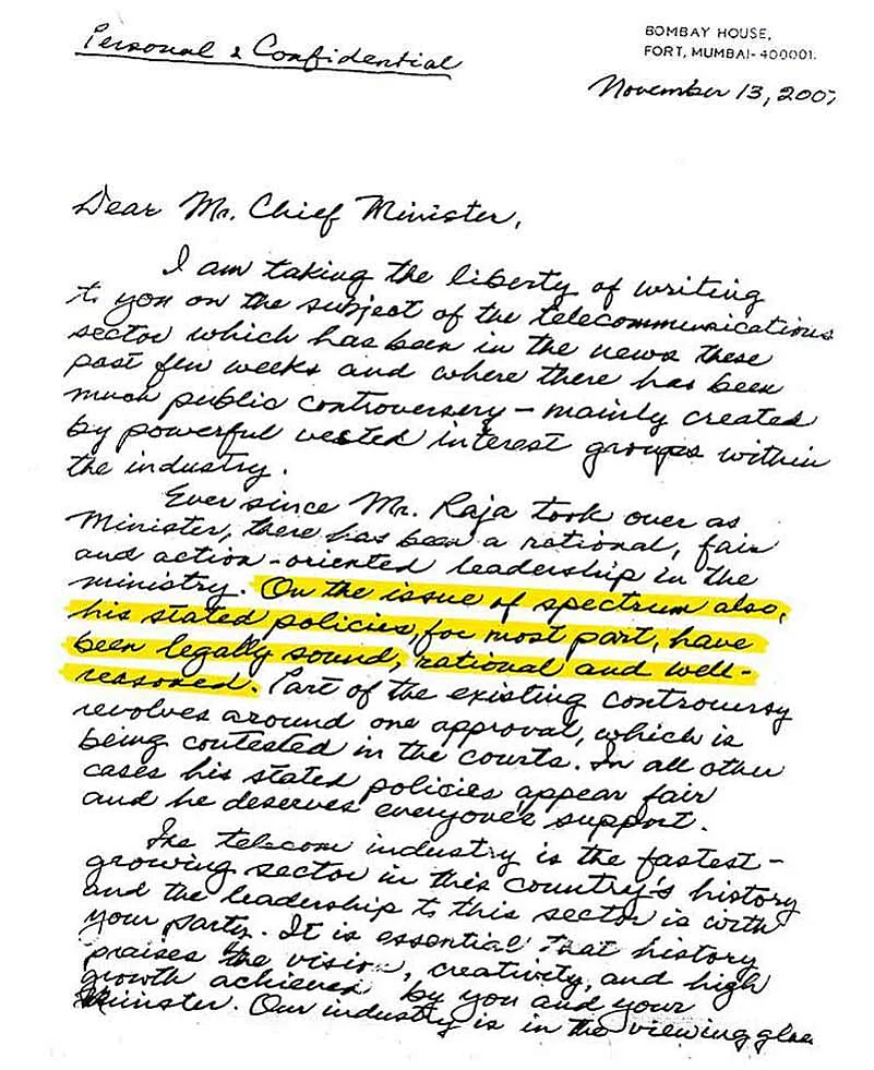 The epistle is remarkable for two other reasons: the direct channel of communication with the DMK top boss (although it was only a partner in the UPA coalition) and the quick certificate Tata was inclined to give Raja who had spent no more than a few months in the hot seat. “On the issue of spectrum also, his stated policies, for most part, have been legally sound, rational and well-reasoned,” writes Tata, less than a month after Raja’s controversial move to grant GSM licenses to CDMA operators like Tata Teleservices and Reliance Communications. Tata Tele’s subsequent 27 per cent stake sale to GSM major Docomo, raising over Rs 4,500 crore, raised plenty of eyebrows.