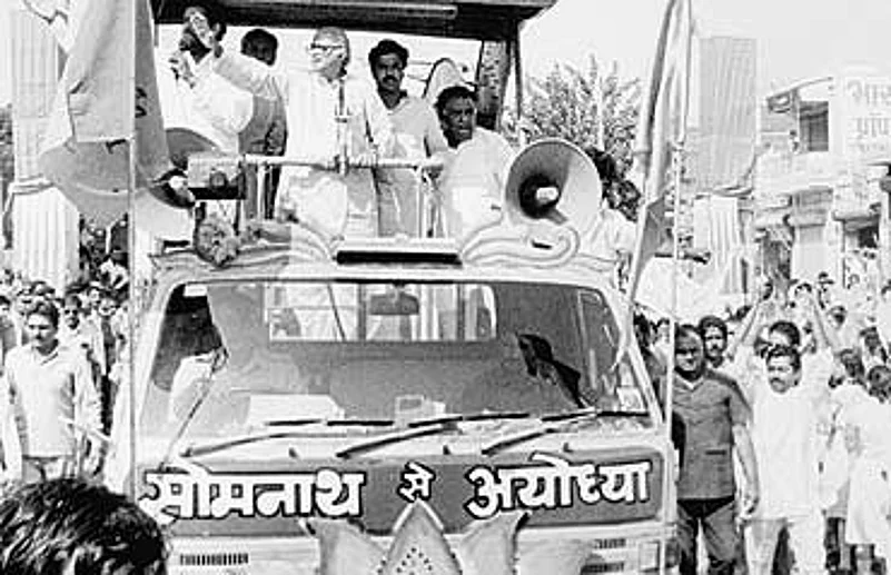 1990 September: Launches rath yatra from Somnath for temple construction.