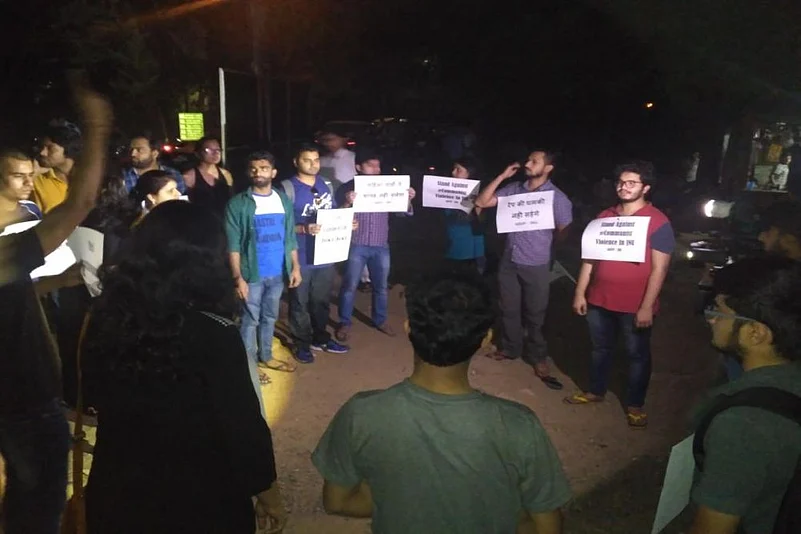 An effigy of the Rashtriya Swayamsevak Sangh and the ABVP was set on fire to protest the film's screening. In the melee, a few students were injured, while the security guard had to be hospitalised.