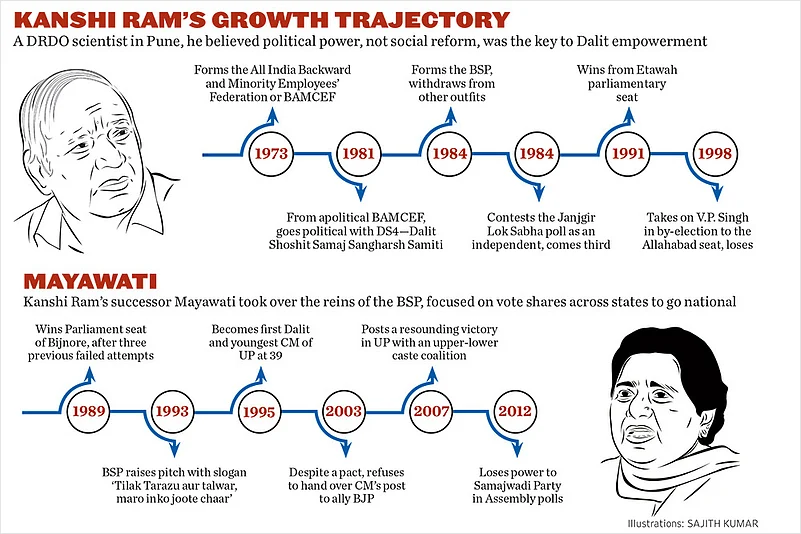 Back in 2007, it came with all the accumulated joy of an old dream being realised. Mayawati was taking oath for the fourth time as CM of India’s most populous and political state of Uttar Pradesh—this time with a majority unprecedented for any Dalit party. It seemed like Dr B.R. Ambedkar’s dream of a self-sustaining Dalit politics, which he initiated in 1936 by founding the Independent Labour Party (ILP), was finally bearing fruit. Mayawati’s rise was ascribed to the Bahujan Samaj Party’s ideology and its founder Kanshi Ram’s vision.