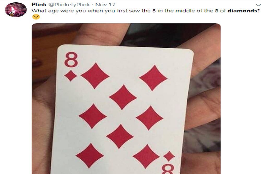 Recently, a Twitter user who goes by the handle @PlinketyPlink shared a photo of an eight of diamonds from a deck of cards and asked, "What age were you when you first saw the 8 in the middle of the 8 of diamonds?".