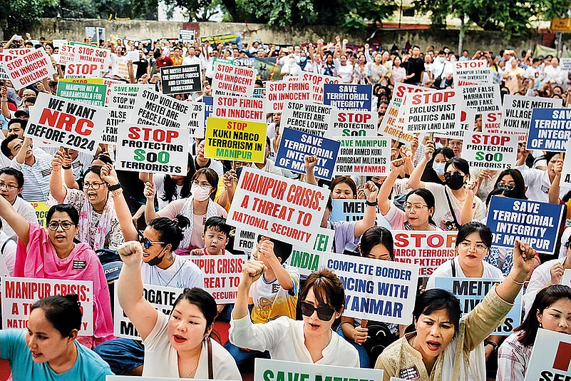 Meanwhile, in Churachandpur, which the tribals have renamed “Lamka”, the mood is grim but steadfast. Renthlei, Vualzong and other tribal leaders who recently met Union Home Ministry officials have reiterated their demand for a separate administration for hill districts. “We don’t see any way for Kukis and Meiteis to coexist anymore,” says Renthlei. Cut off from the state’s political and economic centre, Kuki communities have been struggling to rebuild their lives after the violence. Over 50,000 people have been displaced in the conflict and the hills are today overcrowded with relief camps awaiting aid from the government. “Both sides have suffered in this violence. Going separate ways is the only way to bring peace,” adds Renthlei.