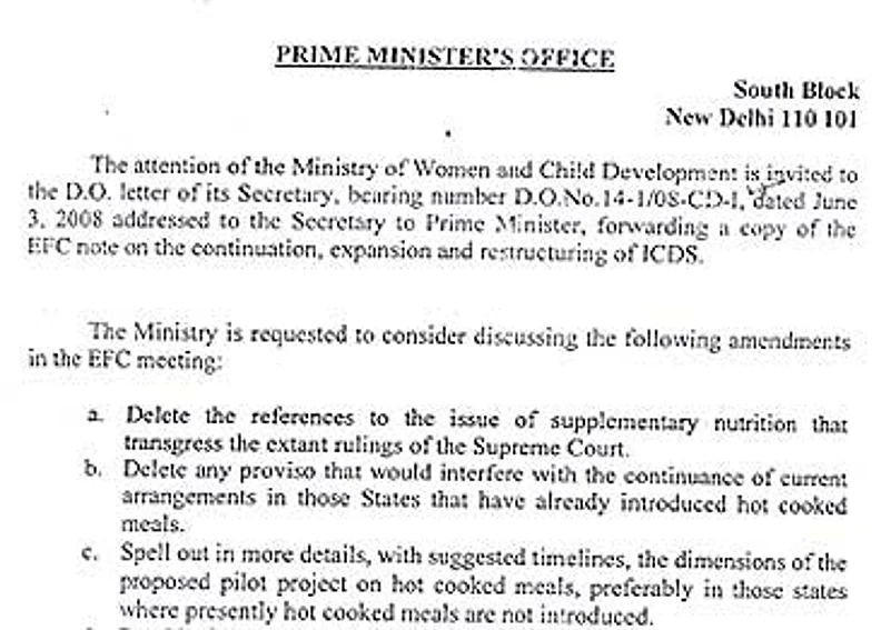 Her pique, whether or not justified, is a natural reflex. For, the PMO note has unambiguously asked her ministry to delete references to the issue of supplementary nutrition (or fortified food). Such a policy, it goes on to emphasise, would "transgress the rulings of the Supreme Court", which had in October 2004 set out the manner in which hot, cooked meals should be provided to children—and ruled simultaneously that it was the responsibility of state governments, not contractors, to implement the scheme. The packaged food programme, on the contrary, involves centralised procurement through contractors.