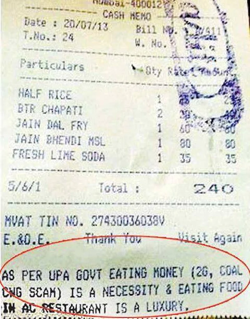 Freedom of speech and expression, anyone? Our politicians waste no time in criticising their opponents. But when owner of a central Mumbai restaurant decided to take on the UPA government's policy on service tax with a rather mild swipe on its bill, it was not too well received by Congress workers who kicked up quite a row. All that he bill at Aditi restaurant opposite the busy KEM hospital mentioned was, “As per UPA govt eating money (2G, Coal, CWG scam) is a necessity & eating food in an AC restaurant is a luxury.”