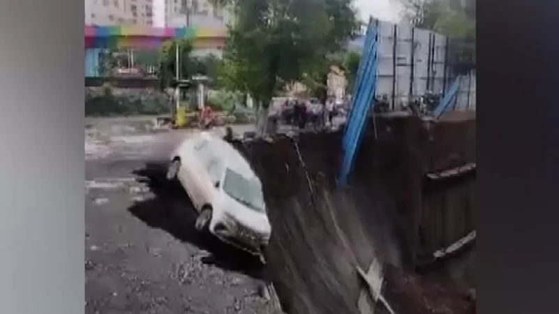 A video of the incident went viral on social media, in which a white car was seen slipping down into the excavated area when the road caved-in.