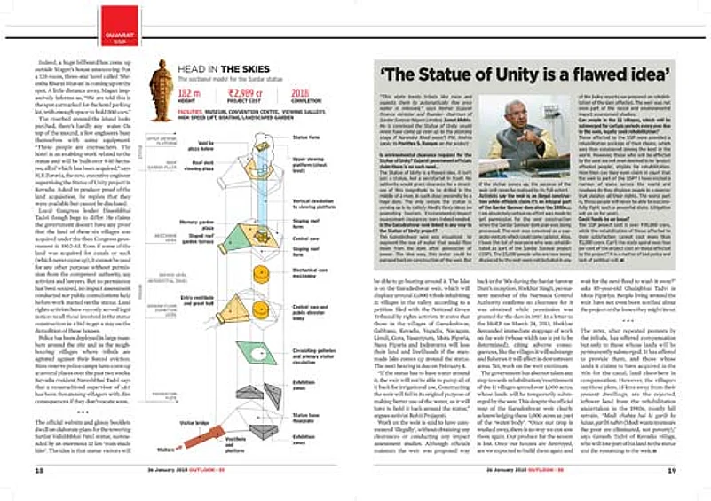 The statue is to be installed by April 2018, nicely timed to be just a year ahead of the Lok Sabha elections. It will be installed at Sadhu Bet, an island 3 km downstream from the Sardar Sarovar Dam. The nearly Rs 3,000-crore project will bring some attention to the culture and economy of the predominantly tribal-dominated Narmada valley, says Modi’s vision document for the project. But an Outlook investigation in January this year found that compensation had not been paid to the tribals who were being forcibly evicted. And an environment impact assessment study has been given the go-by. A recent plea of the local people was thrown out on technical grounds by the National Green Tribunal.